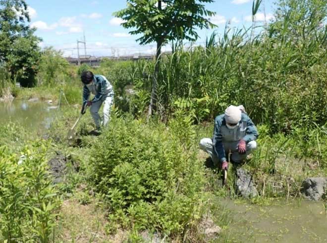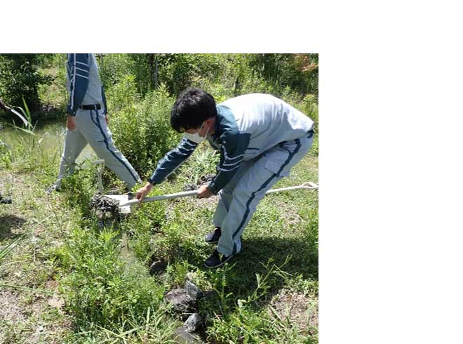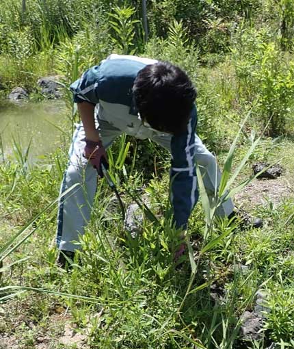 流れの妨げになる草を、カマを使って刈り取っていきます。