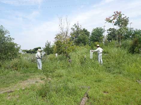 草むらで虫取り網を使い、昆虫を捕まえます。