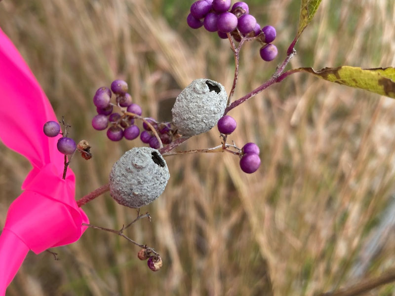 ムラサキシキブには、トックリバチの巣が2つも!?