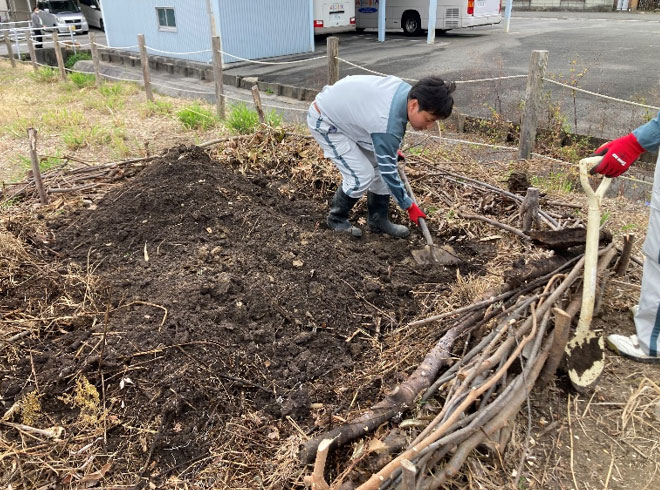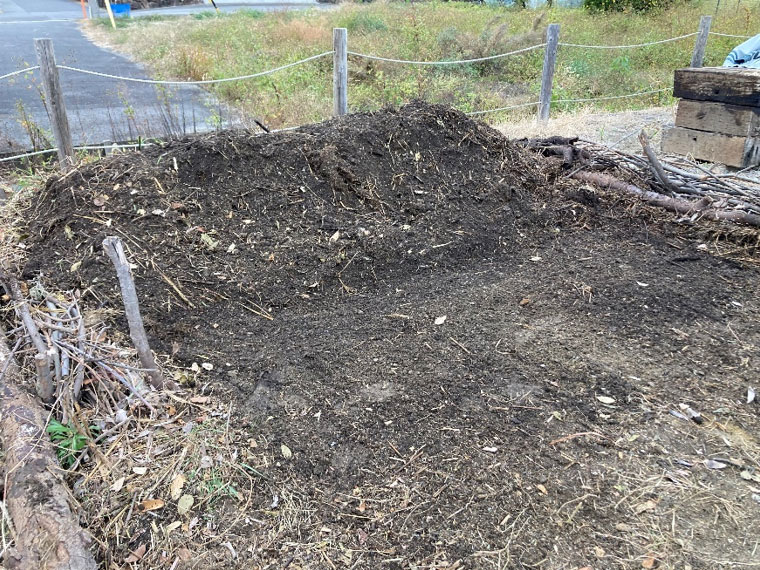ビオトープで剪定した枝葉は、堆肥場において土に還すのが一般的。