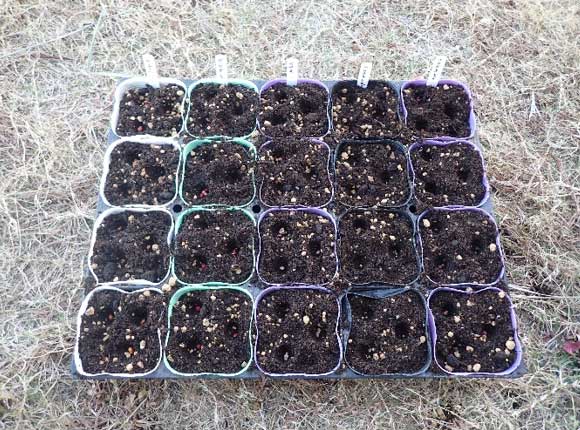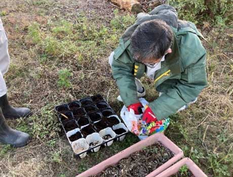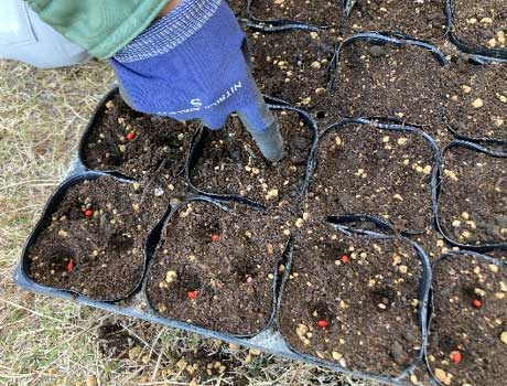 人差し指で軽~く穴をあけて、種をぽいっ。その上からやさしく土をかぶせて完了!