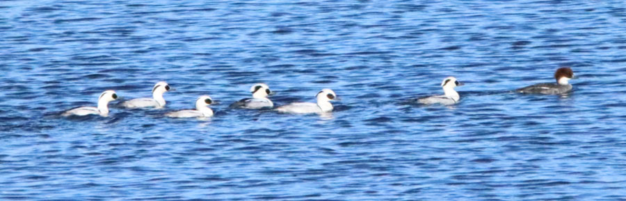 ミコアイサの群れが一列に泳いでいますね!
