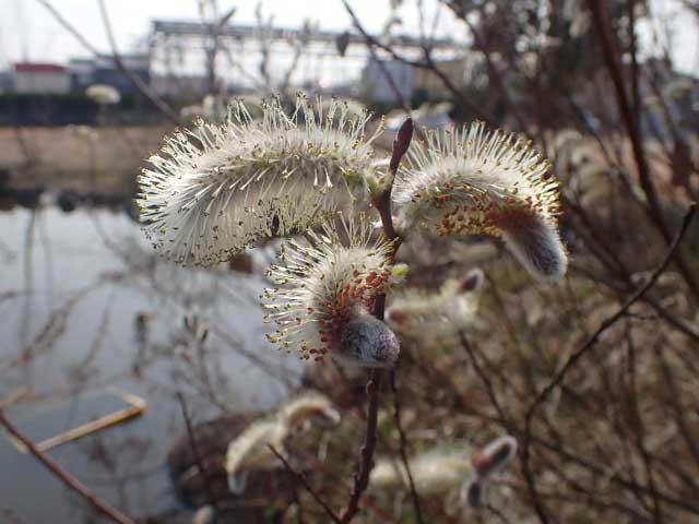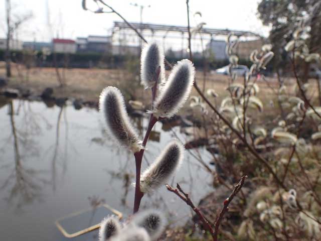 水辺ではネコヤナギの花穂が銀色に色づいています!