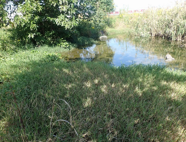 - 運よくビオトープの池に着水。