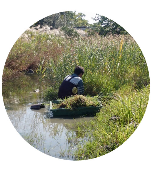 水辺エリアの池で、大繁茂中の水田雑草を除草することにします。