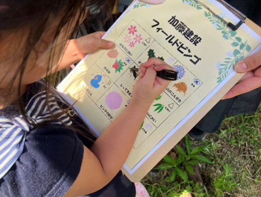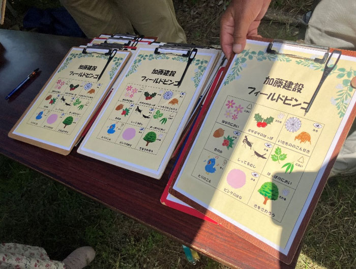 ビンゴ用紙には『花の匂い』や『木を触ろう』など書いており、自然にふれあう内容となっています!