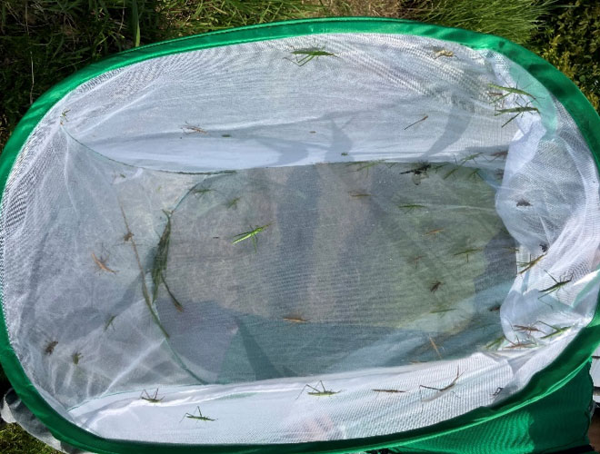 草地エリアではバッタやトンボなど捕まえた虫を観察しました!