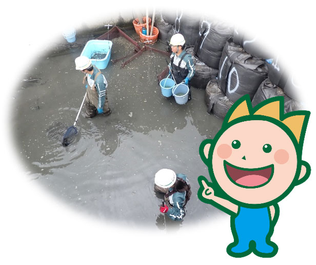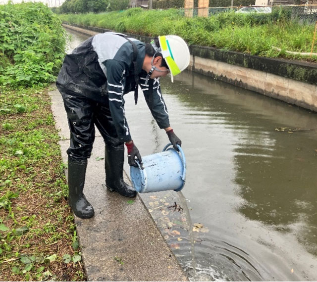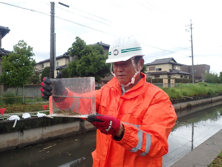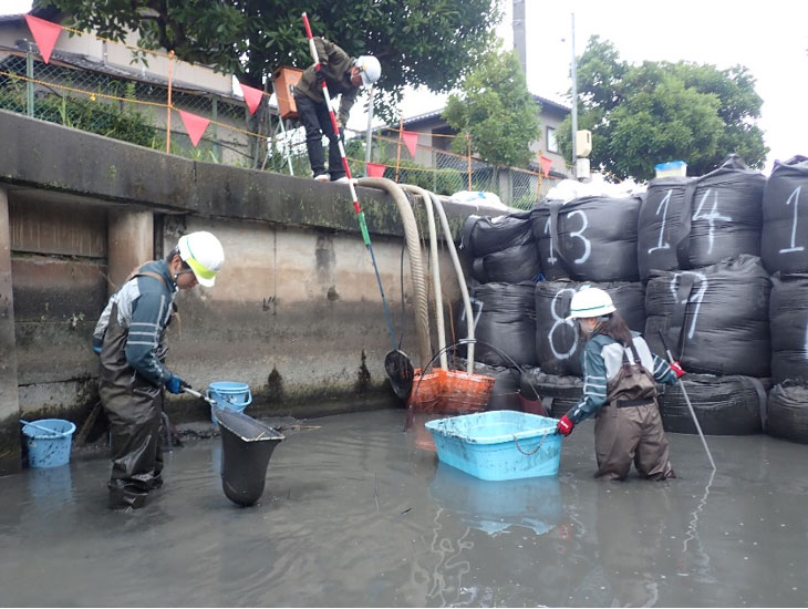 堤防補強工事の現場にて、水路の移設に伴う水抜きをしたとのことで、