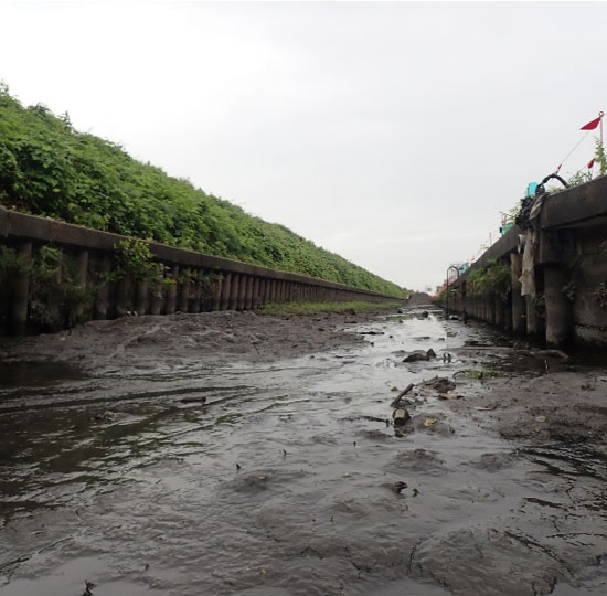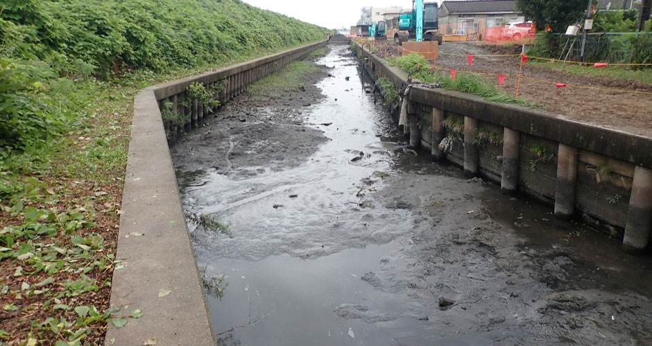 水も抜けてヘドロがあらわに・・・。水路というより沼に近い状態ですね。