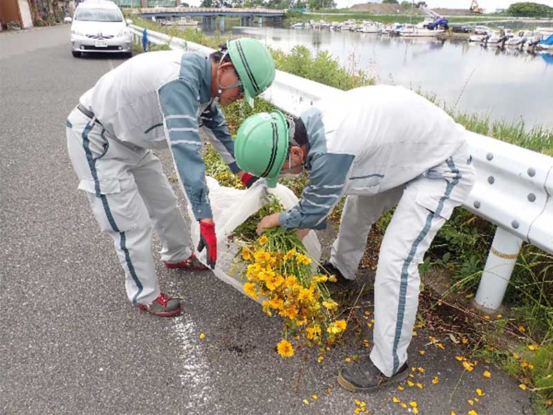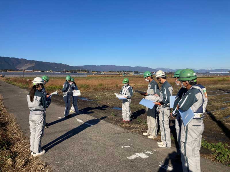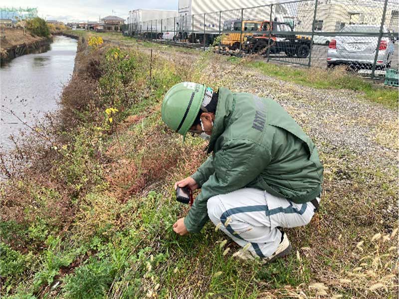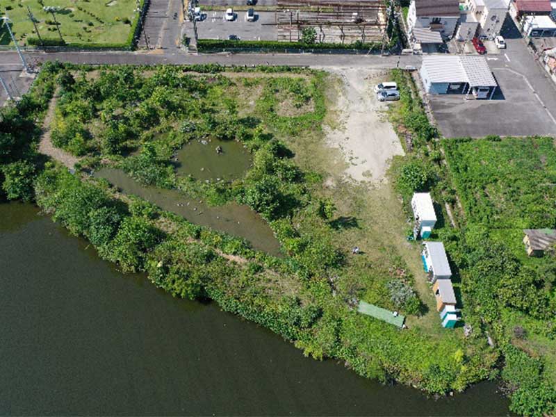 当社は、2009 年より「エコミーティング」(工事現場においてどのような環境配慮ができるかを営業、事務、技術社員も含めた多様な視点で検討実施する取組)を行っており、様々な現場にて生態調査、希少種保護、外来種駆除活動を実施しています。また河川に隣接し、開放的な空間となっている資材置場にビオトープを造成し、地域の生物多様性を守れる拠点づくりを目標として、希少種の保護、植樹などを実施しています。