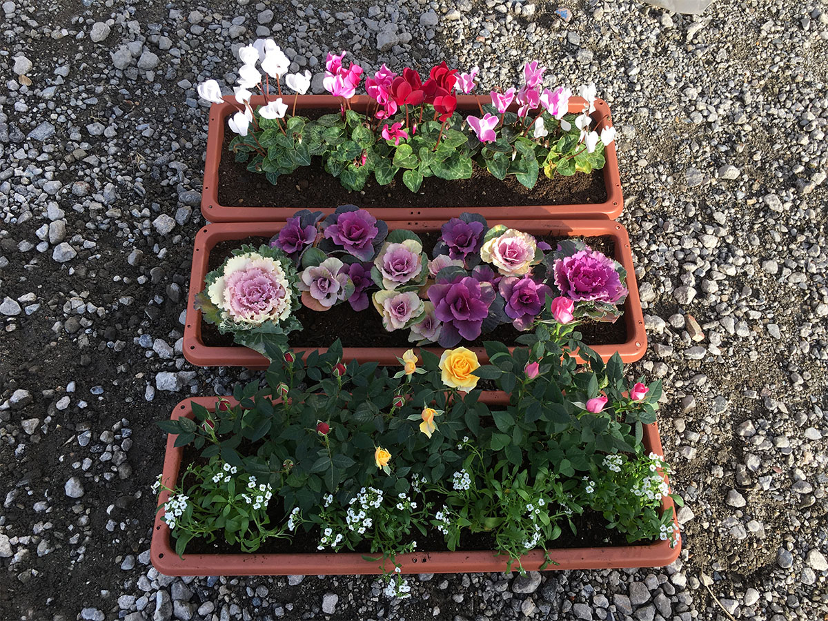 上からガーデニングシクラメン 葉牡丹 ミニバラ です♫