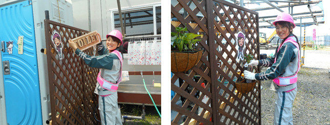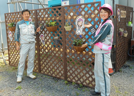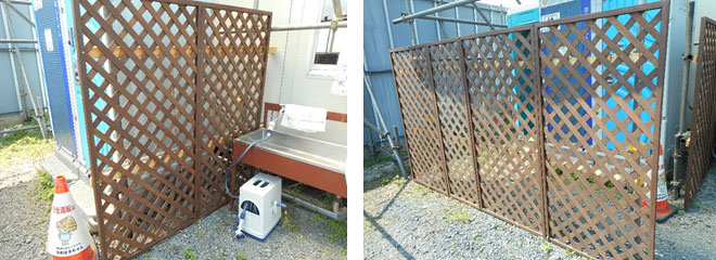 事務所と休憩所、お手洗いとお手洗い前の外構ラティス、