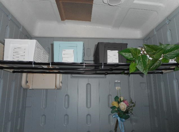 左の快適トイレには、女子パト多用の突っ張り棒で棚を作りました。