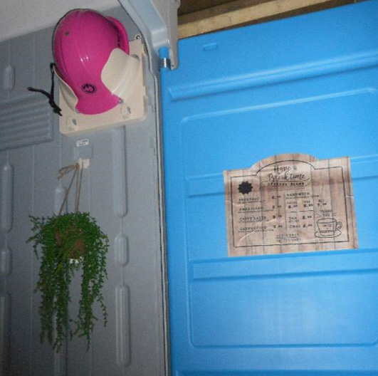 ヘルメットかけ、消臭効果のある造花&ポスターでオシャレに♪