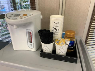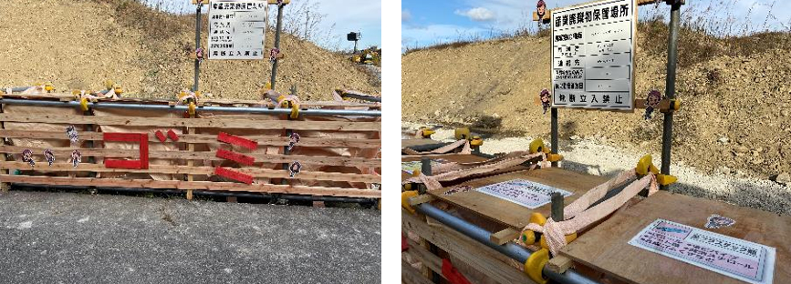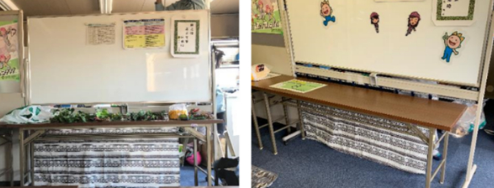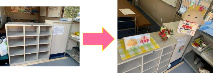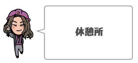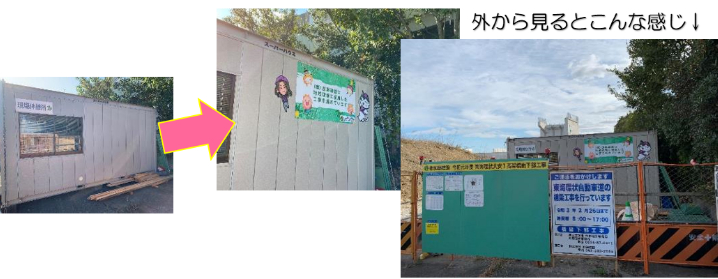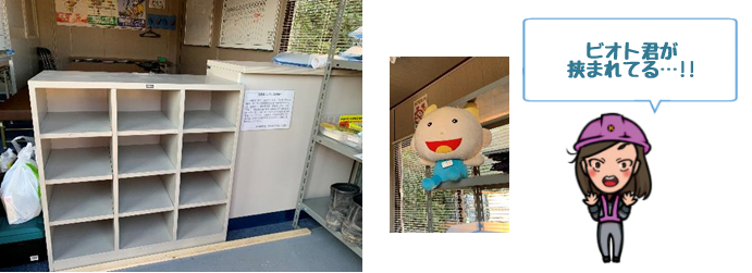 休憩所と打合室の標識ポスターとビオト君が持っているポスターは