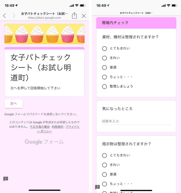 女子パトでは、現場のすこやかさ指標のアンケートにヒントを得て、手書きしていた“女子パトロールチェックリスト”をアンケート仕立てに作ってみました✨