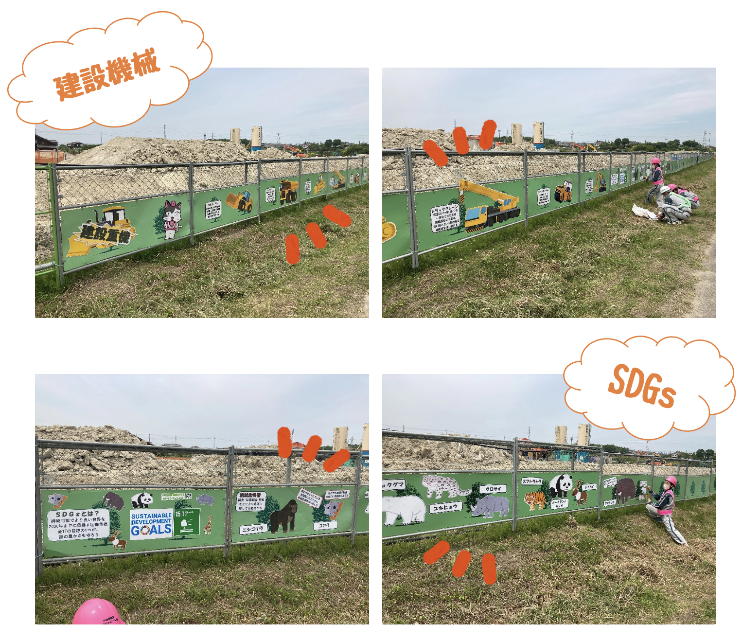 小学生の通学路横のフェンスに建設機械とSDGsの啓発物を掲示しました😊