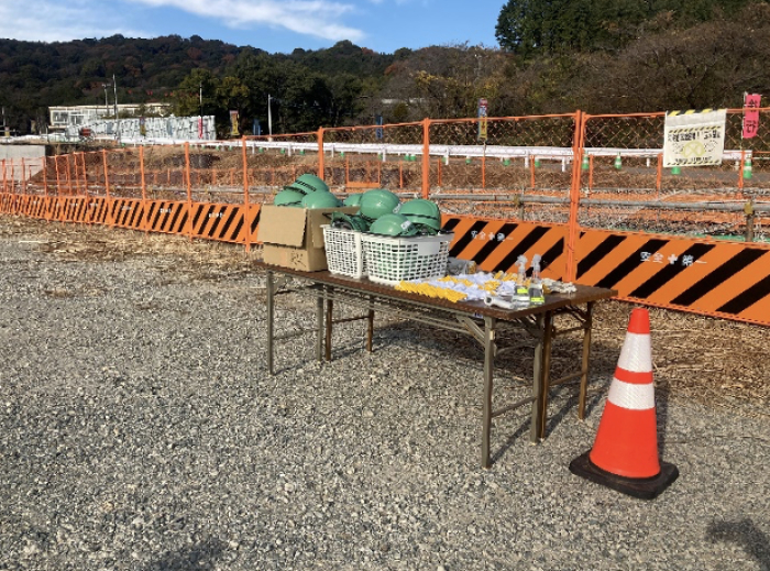 入口でヘルメットや軍手、アルコール消毒や検温の準備を行いました👌