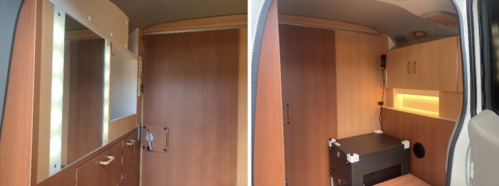 車内にはラップ式トイレやパウダールーム・更衣スペースとしての休憩所、