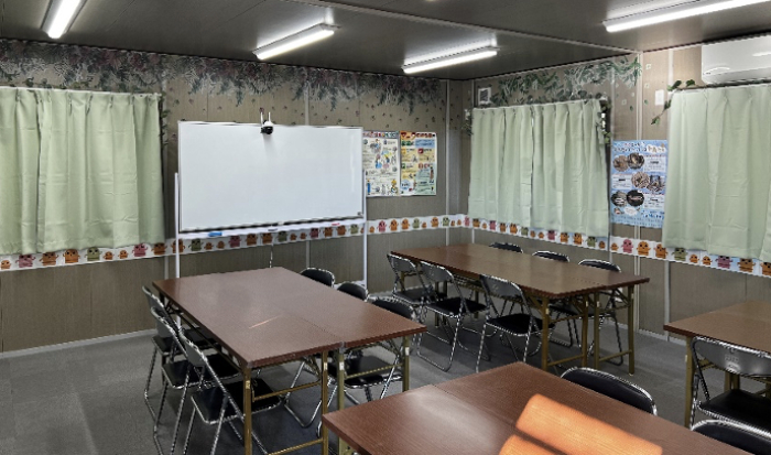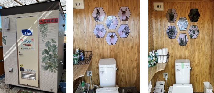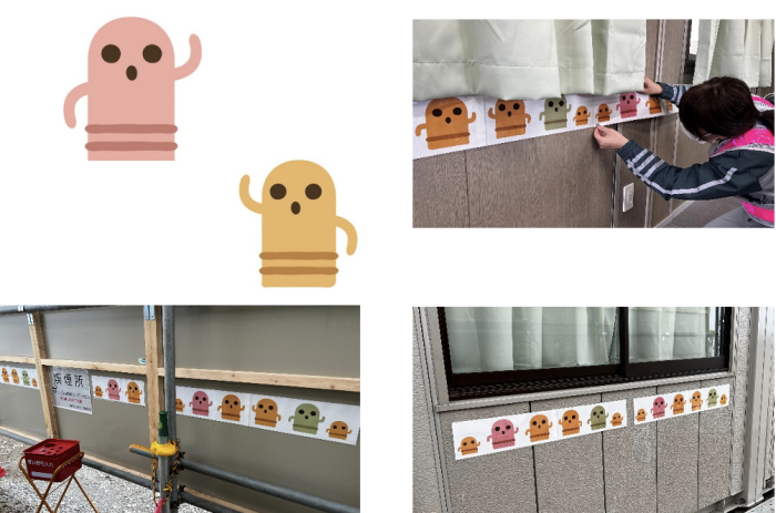 ということで、休憩所室内、外壁、喫煙所にかわいいはにわをペタペタ