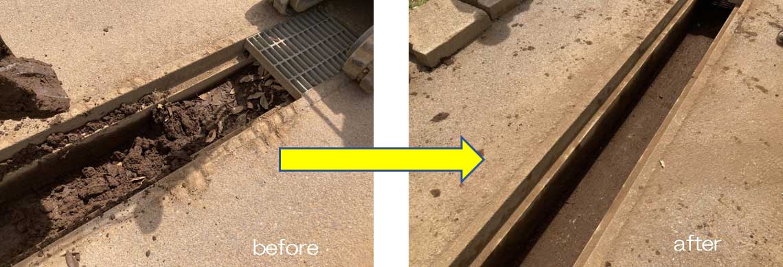 側溝掃除では写真のようにかなりの量の土がたまっていて取り除くのはとっても大変!そこでスーパーアイテム小型重機を出動!スピーディーな作業ですごくきれいになりました✨
