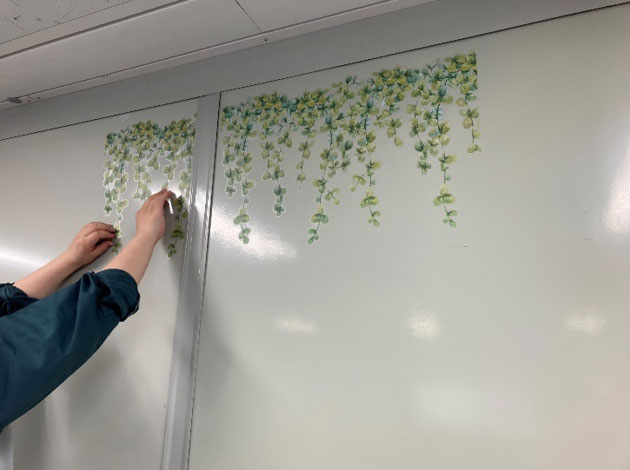 入口から見て右側の壁には、グリーンのウォールステッカーを貼っていきます🍃