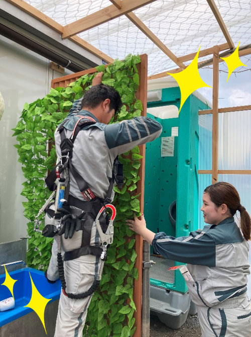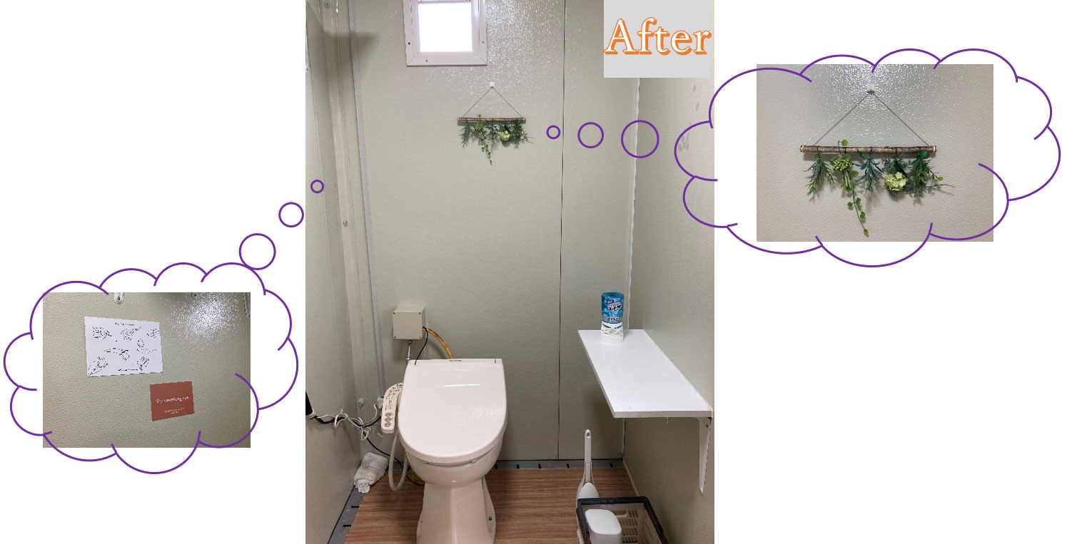 休憩所内トイレにはグリーンやポストカードを貼りました🍃