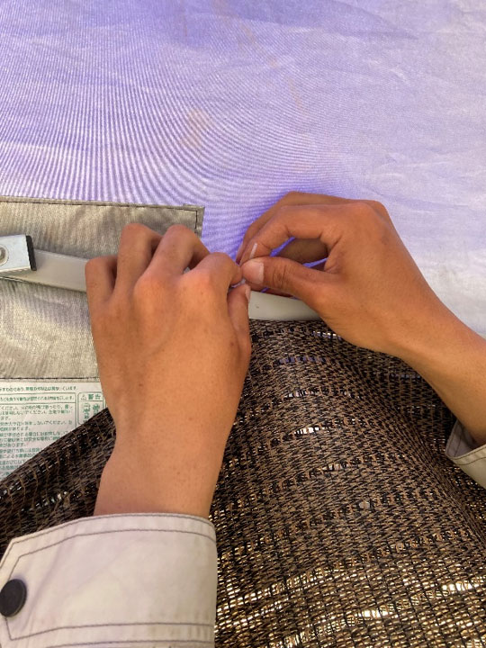 テントの骨組み部分にフックや結束バンドを使って固定していきます!