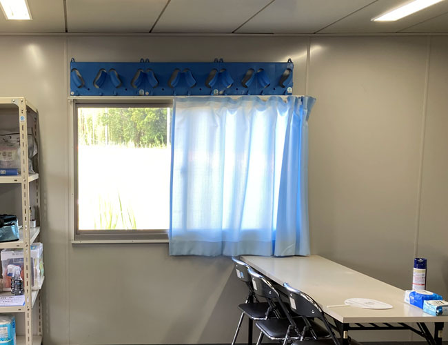 トイレとヘルメットホルダーがブルー系でしたので、掲示物等のカラーコンセプトもブルー系にしたのですが、これ見てください!!!カーテンがブルー系ではありませんか!!