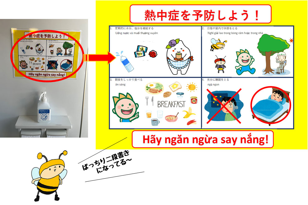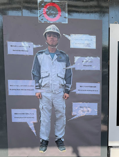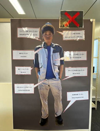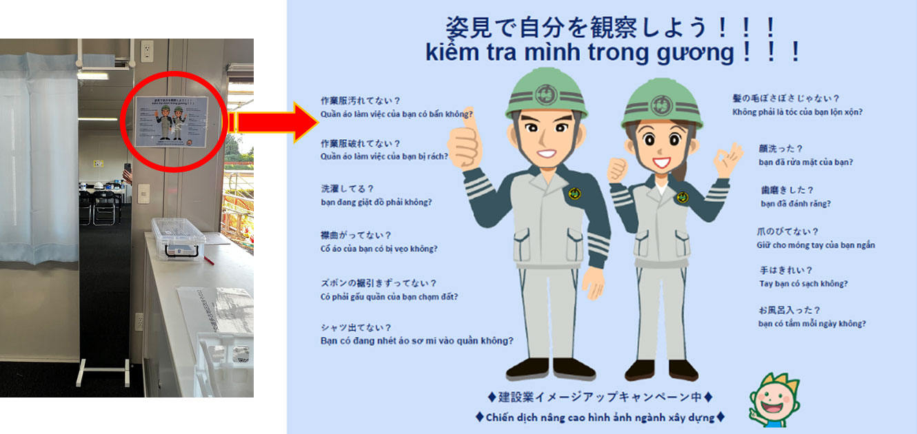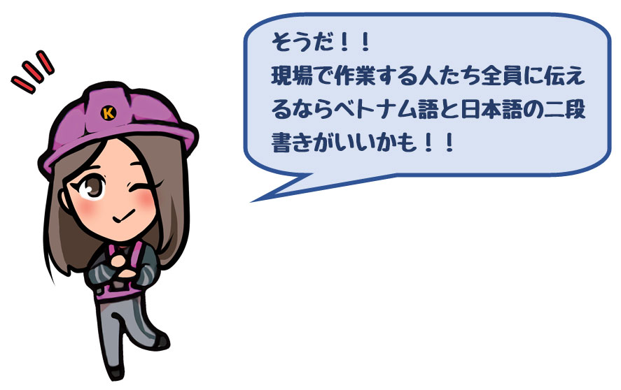 今回コンセプトを身だしなみに設定して動き始めましたが、二段書きは単純に注意喚起や安全のためだけではなく、(外国人労働者にとって)言葉のわからない他国という環境だからこそ、自国の言語で掲示があると少しでも安心してもらえるかなと思いました。