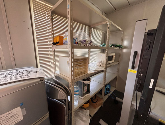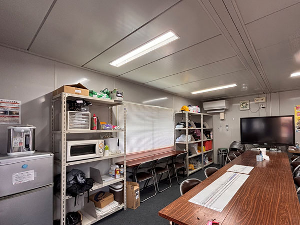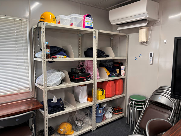 休憩所はモニターの位置を移動させて棚を有効活用できるようにしました。さらに棚には仕切りプレート使ってブロック分けをして、ものが乱雑に置かれないよう、また元の場所に戻しやすいように工夫しました。