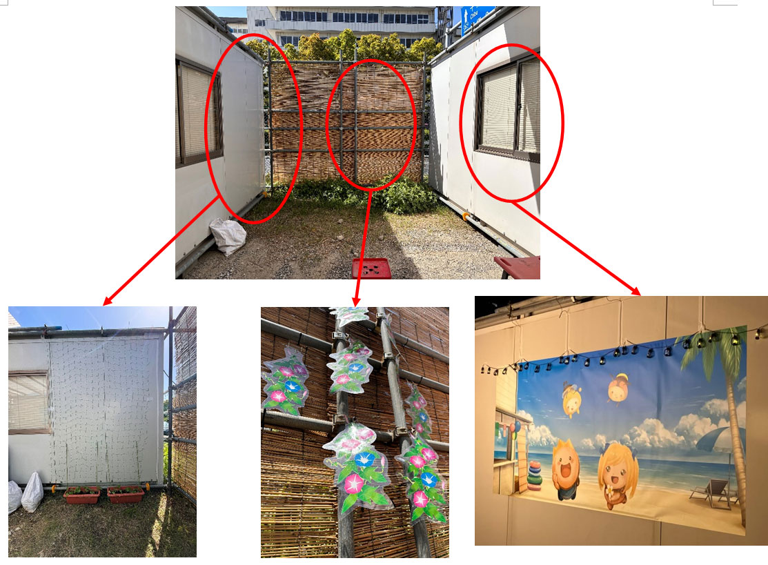 向かって左側は朝顔グリーンカーテンなのですが、出来上がりまで少し寂しいので正面は朝顔のイラストを飾りました。右の海の家風ポスターは1200mm×2700mmの特注サイズで作成し、自分で言うのもなんですが、かなり仕上がりよくできました👏