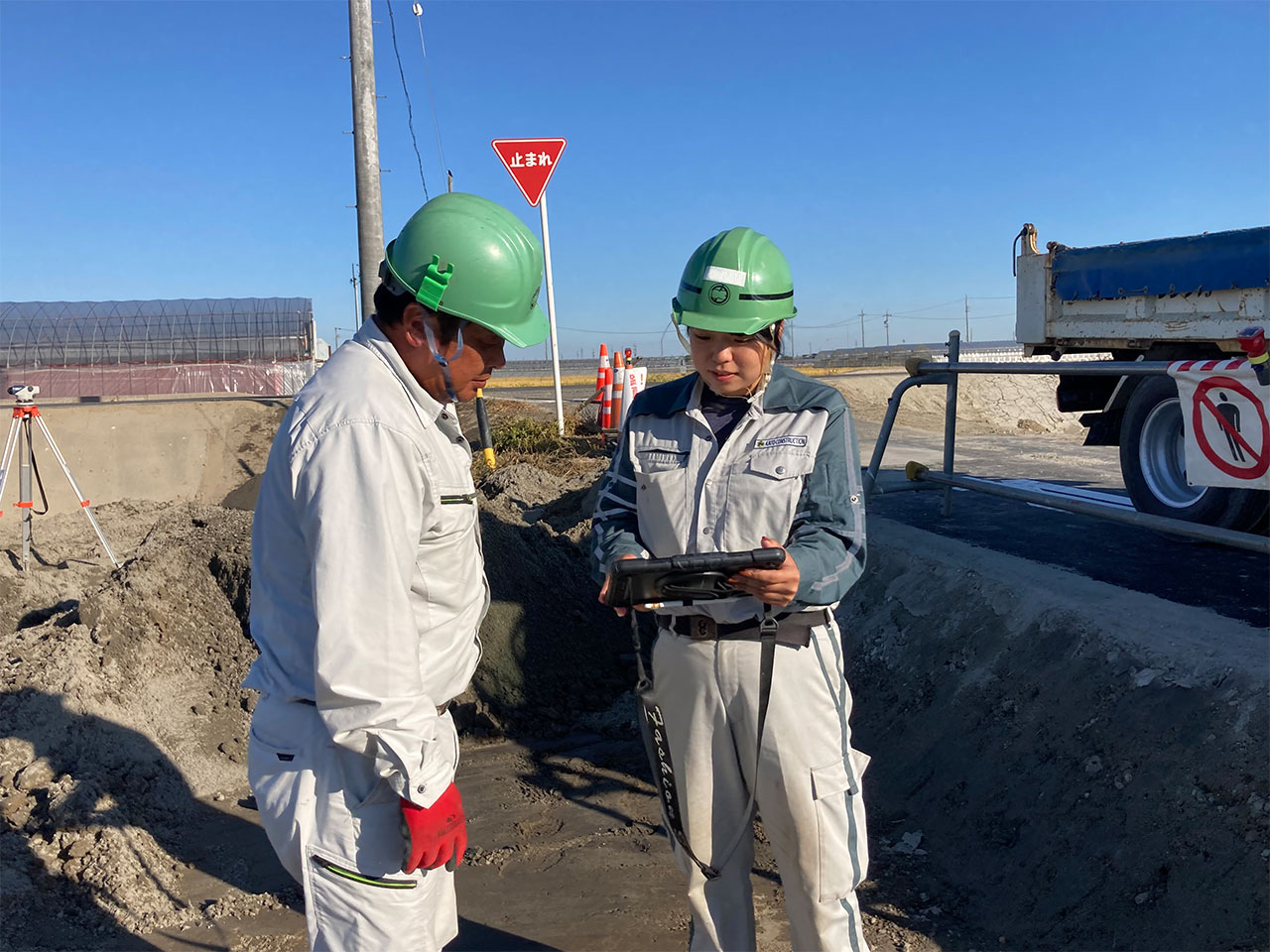 皆さんは土木現場の仕事と聞くと、重い機器を運んだり、力仕事が多いイメージはありませんか?最初は私も心配していたのですが、最新のICT技術はスゴイんです!