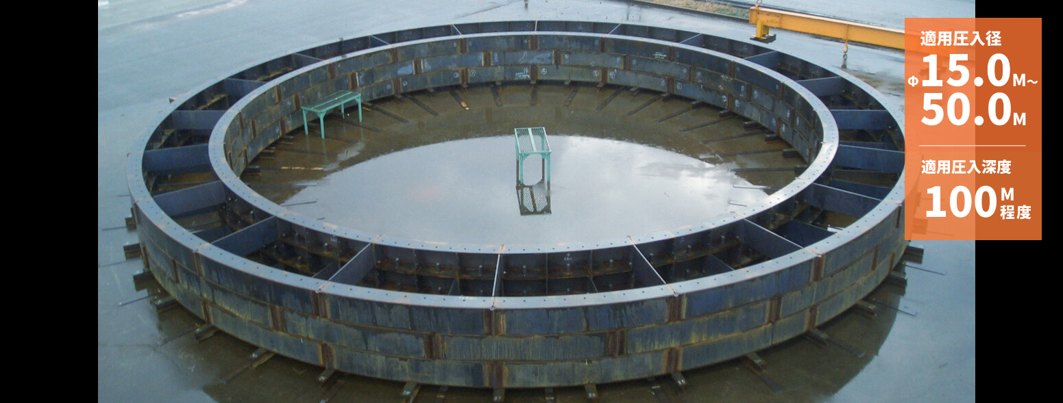 アーバンリング工法が有する狭隘地・急速施工の特徴を活かしつつ、直径30mを超える大口径・深度100m級の大深度立坑をコンパクトかつ急速に施工できる合成構造タイプのセグメント圧入ケーソン工法です。