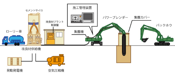 軟弱地盤中に粉体の改良材を供給し、強制的に原位置土と撹拌混合することにより土と改良材を化学的に反応させて、強度を高め土質性状を安定化させる工法です。