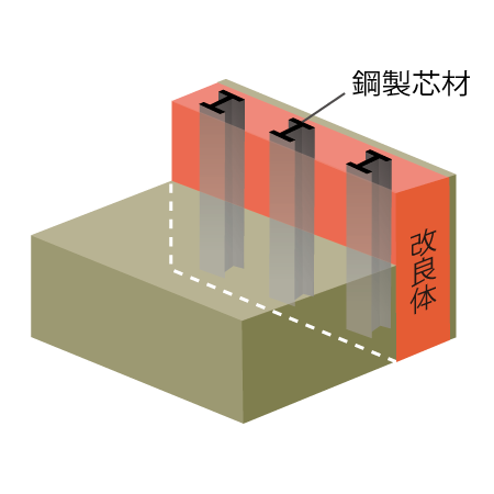 近接施工での格子状や帯状改良での連続した改良体で造成が可能となります。
