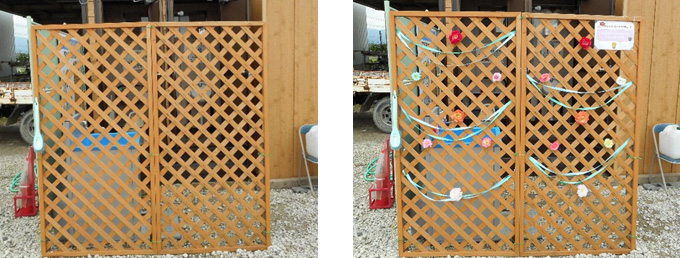 お手洗い前にある柵にはお花とリボンで少しだけ華やかに。