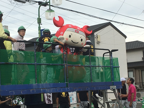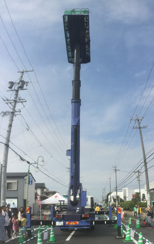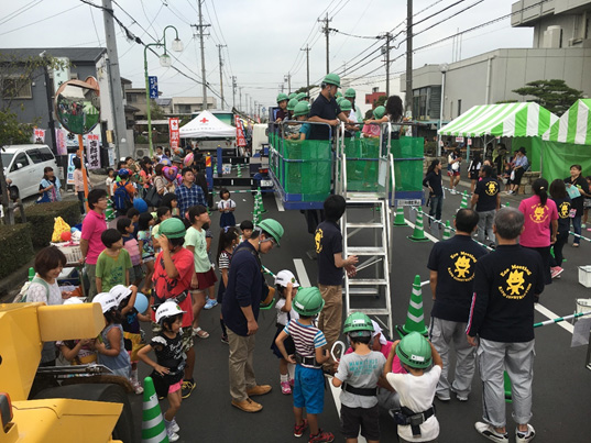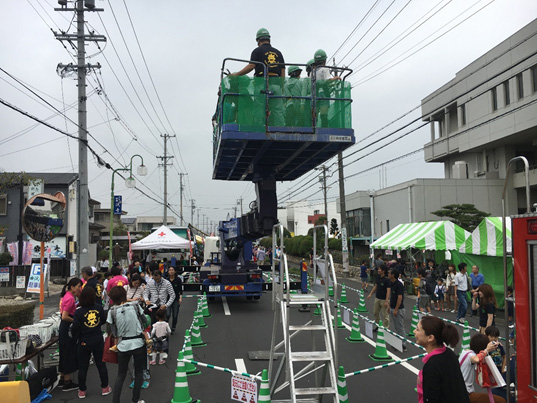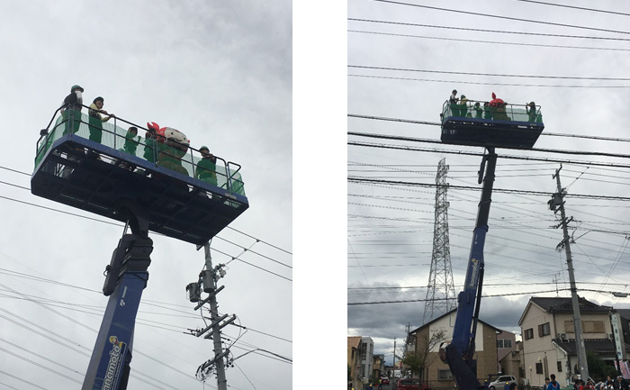 蟹江町のゆるキャラ「ちょき丸」君も高所作業車体験!