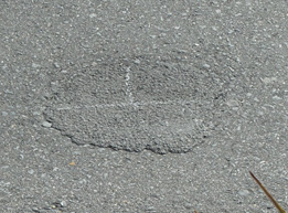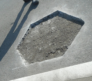 この二車線の道路に仮補修してある部分があるので