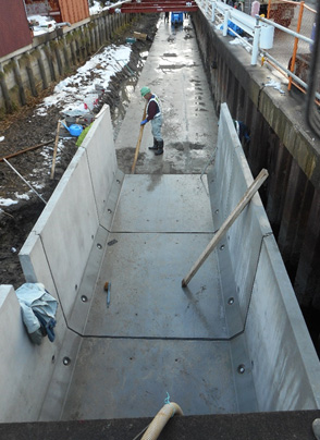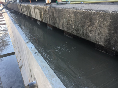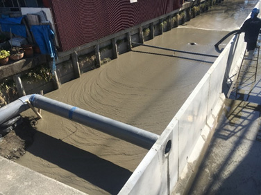 流動化処理土なら、下の写真のようなプレキャストU型水路と壁の間の