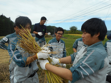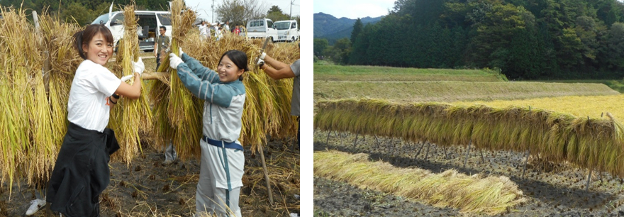 刈った稲は束ねます。新入社員2人の共同作業(^^)