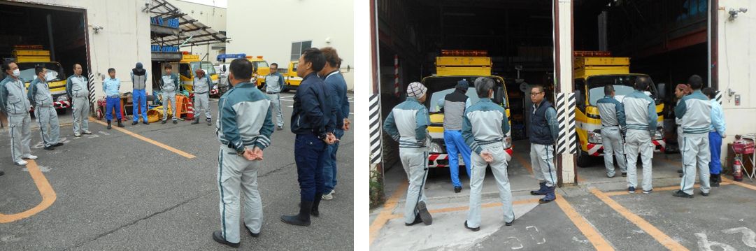 次は全体朝礼、現場別打合せ、KY活動、積み込み作業、