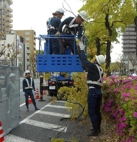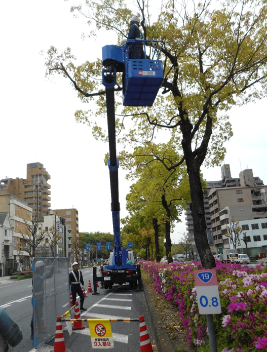 大きな道路の中央にある木々の枯れ枝撤去です。