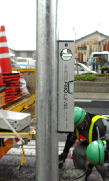 支柱が真っ直ぐなのか確かめるために水平器という道具を使います(^^)