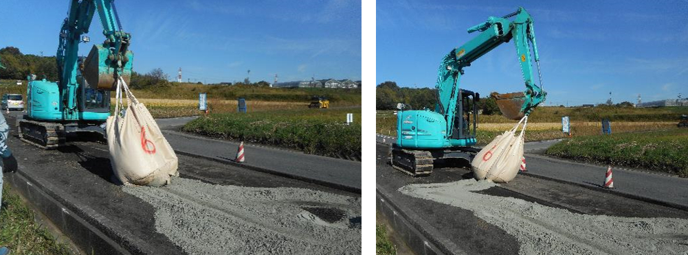 ショベルカーを使ってセメントを大胆に撒いていきます。