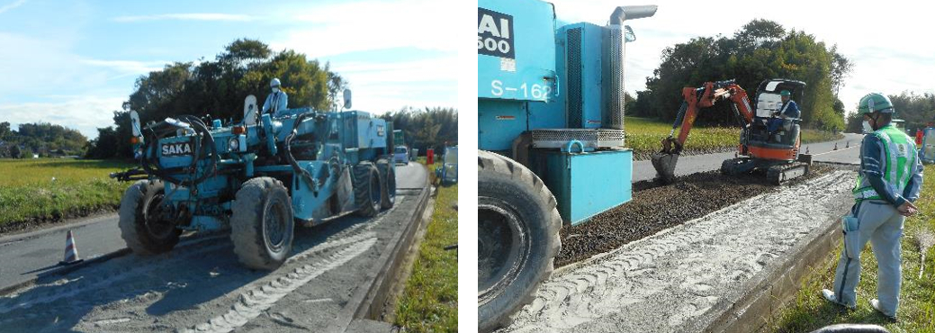 ①古いアスファルトを削る
