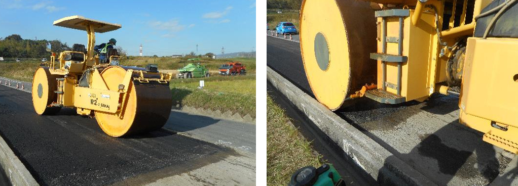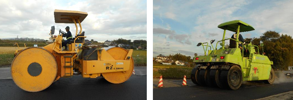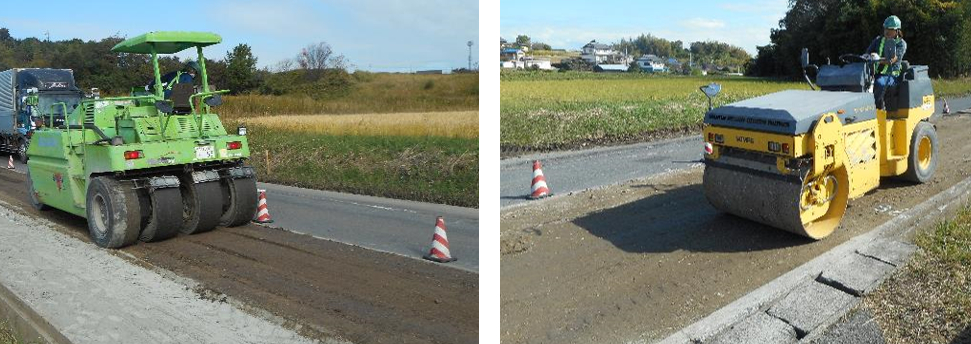強化された下地をタイヤローラー(左)とコンバインローラー(右)で転圧。