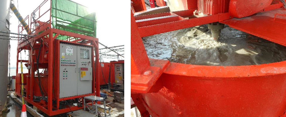 セメントミキサーでセメントと水を決められた分量ずつ混ぜ合わせて、