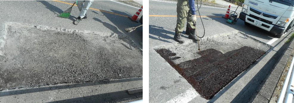 まず路盤とアスファルトをくっつきやすくするために乳剤を撒いていきます。