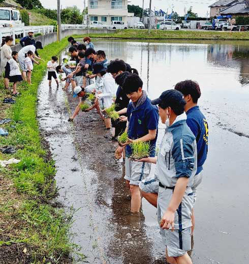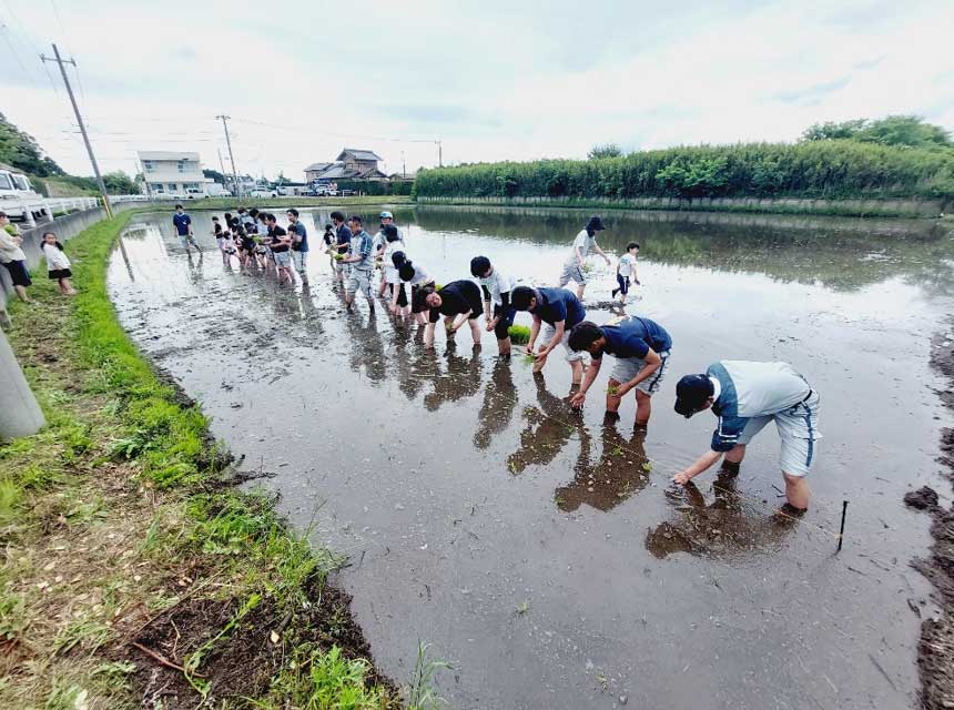 植え方の説明を聞いてから横一列に並んで一斉に植えていきます。